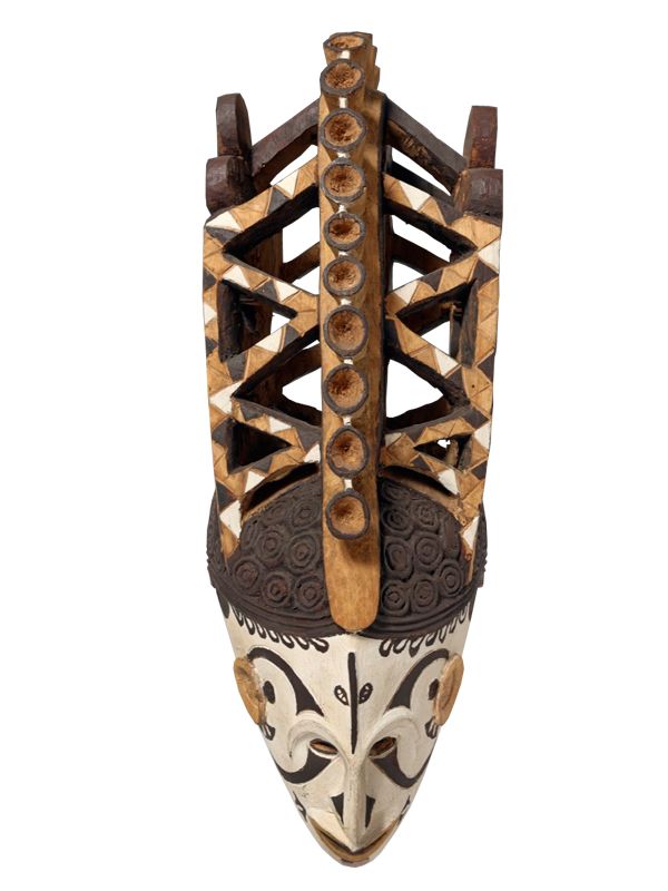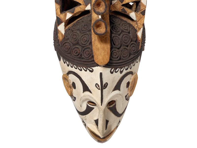 This is an example of a painted wooden mask from the Nri Awka region of Igboland in south east Nigeria known as ‘maiden masks or maiden spirit masks’. The masks are typically worn for social regulation, during agricultural cycles and in funerary processions. Masks are carved to highlight the petite features of young women and painted with a white chalk substance to represent a pale complexion, giving the mask a spiritual, ghostly quality. Masks are accompanied with multi coloured, close fitting, appliquéd costumes and topped with an elaborate hairstyle, embellished with representations of hair combs modelled after 19th century ceremonial hairstyles. The ‘fame of the maiden’ masquerade is used to educate young girls in what is considered to be the African ideal of physical and moral beauty. It is perhaps surprising, therefore, that these costumes are actually worn by young adult males who, when dressed as beautiful maidens, mimic, in exaggerated performance, typical female gestures and behaviour.